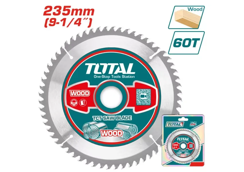 Սղոցի սկավառակը նախատեսված է փայտի երկայնական և անկյունագծային կտրման համար: Ատամներն ամրացված են կարբիդային ներդիրներով, որոնք ապահովում են արտադրողականության բարձրացումն ու շեղբի պիտանելիությունը: Ատամները երաշխավորում են ֆրեզերային կտրումը: Համատեղելի է TOTAL TS1222356 անկյունային սղոցի հետ։ Տրամագիծը՝ 235 մմ(235*3*25.4)։