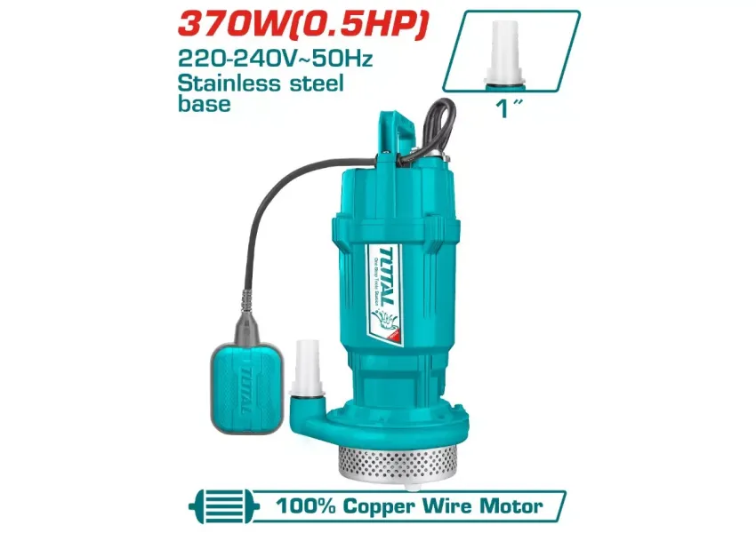 TOTAL TWP63706 հորի պոմպը նախատեսված է նկուղներից, լողավազաններից և այլ տեղերից մաքուր ջրի մատակարարման, հեռացման համար։ Հագեցած է 370 Վտ (0,5 ձիաուժ) հզորությամբ պղնձե շարժիչով, որը ապահովում է մինչև 17 մետր բարձրություն և մինչև 100 լիտր/րոպե արտադրողականություն: Պոմպը ունի ամուր կառուցվածք՝ չժանգոտվող պողպատից հիմքով, պտուտակներով և լիսեռով, ինչը երաշխավորում է երկարակեցություն և կոռոզիայից պաշտպանություն: Խողովակի տրամագիծը 1 դյույմ է, իսկ 9 մետրանոց մալուխը ապահովում է միացման հարմարավետություն: Բացի այդ, պոմպը հագեցած է ջերմային պաշտպանությամբ և լողացող անջատիչով՝ ջրի մակարդակի ավտոմատ կառավարման համար: