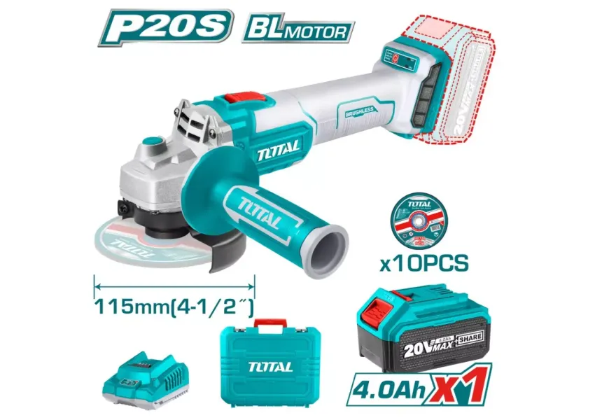 TOTAL 115 մմ Մարտկոց Li-Ionային պրոֆեսիոնալ անկյունային հղկող մեքենան թեթև և հզոր գործիք է տարբեր նյութերի կտրելու և հղկելու համար։ Բարձր արդյունավետությամբ անխոզանակ շարժիչը ապահովում է բավարար հզորություն՝ ինչպես կտրելու, այնպես էլ հղկելու և նույնիսկ քարի մշակման համար։ Էրգոնոմիկ կորպուսը էլաստիկ ծածկույթով ապահովում է վստահելի կառավարման հարմարավետություն, իսկ թվային երկաստիճան արագության կարգավորումը, հարթ գործարկումն ու տարրային օդային ֆիլտրի հեռացումը ավելացնում են անվտանգության և օգտագործման հարմարավետությունը։