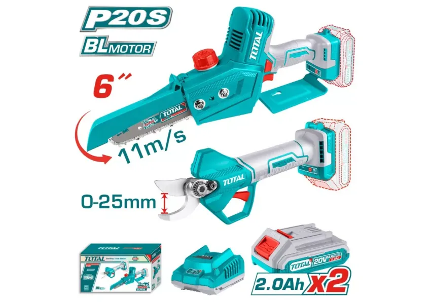 Կոմբո հավաքածուն իդեալական է այգեգործական աշխատանքների համար։ Հավաքածուն ներառում է` 1) TOTAL TGSLI2068 20Վ մարտկոցային մինի շղթայավոր սղոց. շղթայի չափը՝ 1.1մմ - 1/4', երկարությունը՝ 150մմ, արագությունը՝ 11մ/վ։ Առկա է ավտոմատ յուղման գործառույթ։ 2) TOTAL TSSLI20258 20Վ էտելու մարտկոցային գործիք (սեկատոր). կտրման տրամագիծը՝ 25մմ։ Փաթեթում առկա է. 1 հատ յուղի շիշ (դատարկ), 1 հատ սրաքար, 1 հատ շղթա (150մմ), 1 հատ սղոցի անվադող (150մմ), 1 հատ բանալի, 2 հատ 2.0Աժ մարտկոց (TFBLI20011), 1 հատ լիցքավորիչ (TFCLI2001)։