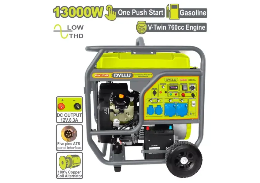 13կՎտ (նոմինալ՝ 12կՎտ) հզորությամբ բենզինային գեներատորը երաշխավորում է կայուն էլեկտրամատակարարում։ Հինգ կոնտակտով ավտոմատ պահուստային միացման (ATS) վահանակի ներկառուցված ինտերֆեյսն ապահովում է գեներատորի ակնթարթային միացումը՝ հիմնական էլեկտրամատակարարման անջատման դեպքում։ Հագեցած է հուսալի 2-գլանային V-աձև շարժիչով՝ 760 սմ³ ծավալով և օդային հովացման համակարգով։ Գործարկվում է մեկ կոճակի սեղմմամբ՝ շնորհիվ մարտկոցով էլեկտրական մեկնարկիչի։ THD < 5% գործակիցը թույլ է տալիս անվտանգ միացնել նույնիսկ զգայուն էլեկտրոնիկան։ ՎԱռկա է թվային էկրան (ժամ, հերց, վոլտ)։ 50 լիտր տարողությամբ վառելիքի մեծ բաքը՝ երկարատև ինքնավար աշխատանքի համար։