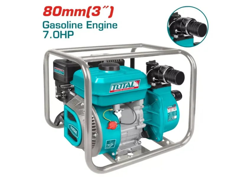 TOTAL TP3302 ջրի բենզինային պոմպը հուսալի սարքավորում է ջրի մատակարարման համար։ Ներքաշման և արտանետման անցքի տրամագիծը՝ 80 մմ։ Ջրի առավելագույն հոսքը՝ 1000 լ/ր, քաշելու առավելագույն բարձրությունը՝ մինչև 32 մ, իսկ ներծծման խորությունը՝ մինչև 8 մ։ Հագեցած է 7 ձիաուժ հզորությամբ բենզինային շարժիչով։ Գործարկումը կատարվում է կոճի միջոցով, ինչը հեշտացնում է շահագործումը։