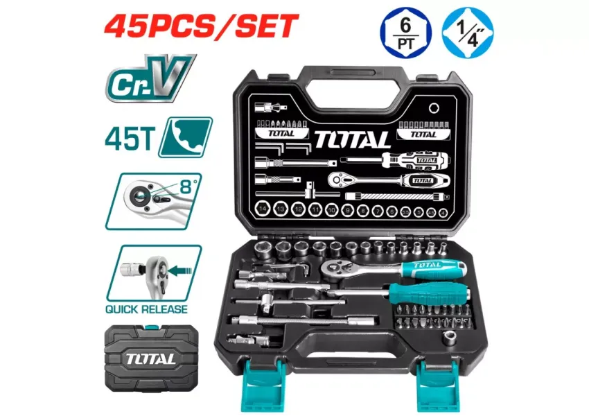 Հավաքածուի մեջ․ 1 հատ բռնակ 45T, 13 հատ գլխիկ (4մմ, 4.5մմ, 5մմ, 5.5մմ, 6մմ, 7մմ, 8մմ, 9մմ, 10մմ, 11մմ, 12մմ, 13մմ, 14մմ), 1 հատ բռնիչ, 2 հատ երկարացման ձող (50մմ, 100մմ), 1 հատ պտուտակահանի բռնակ 150մմ, պտուտակահանի 20 հատ բիթ (PH1, PH2, PH3, PZ1, PZ2, PZ3, SL4, SL5, SL6, H1.5, H2, H3, H4, H5, H6, T10, T15, T20, T25, T30), 1 հատ կրիչ, 1 հատ T-աձև բռնակ 114մմ, 4 հատ վեցանկյուն բանալի (1.5մմ, 2.0մմ, 2.5մմ, 3.0մմ):