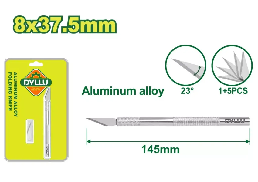 DYLLU DTSK1061 դանակը կիրառվում է, երբ անհրաժեշտ է կատարել տարբեր նյութերի ճշգրիտ կտրում կամ հատում։ Փաթեթում առկա է 5 հատ սայր (նյութը՝ SK5 պողպատ)։