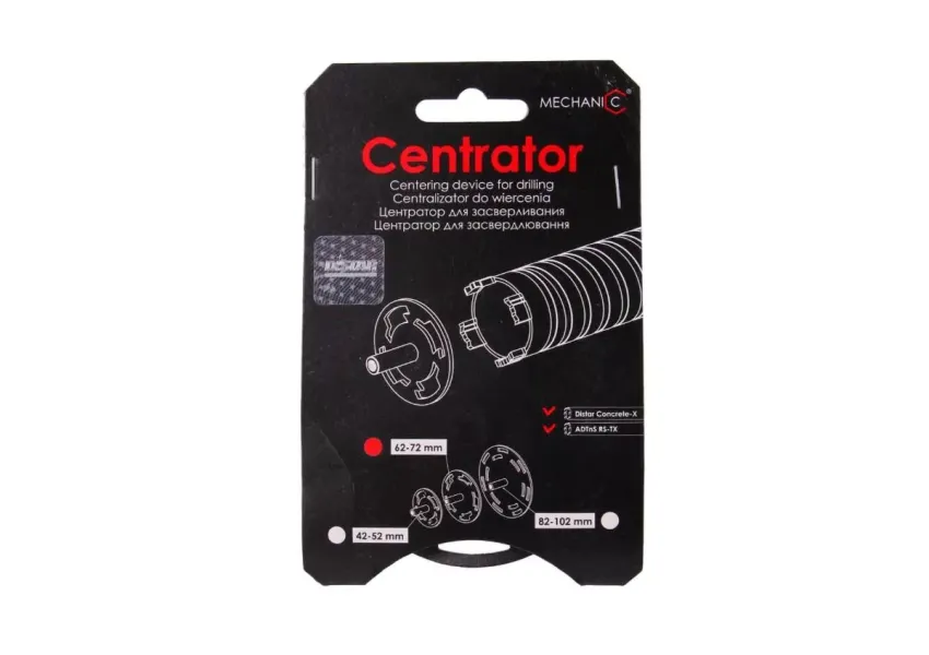 Mechanic CENTRATOR RS/RM-TX 62/72մմ կենտրոնացուցիչն ապահովում է ճշգրիտ կենտրոնաբերում՝ բետոնի, աղյուսի և սալիկի հորատման ժամանակ՝ առանց թրթռման, հարթ ու մաքուր եզրերով։