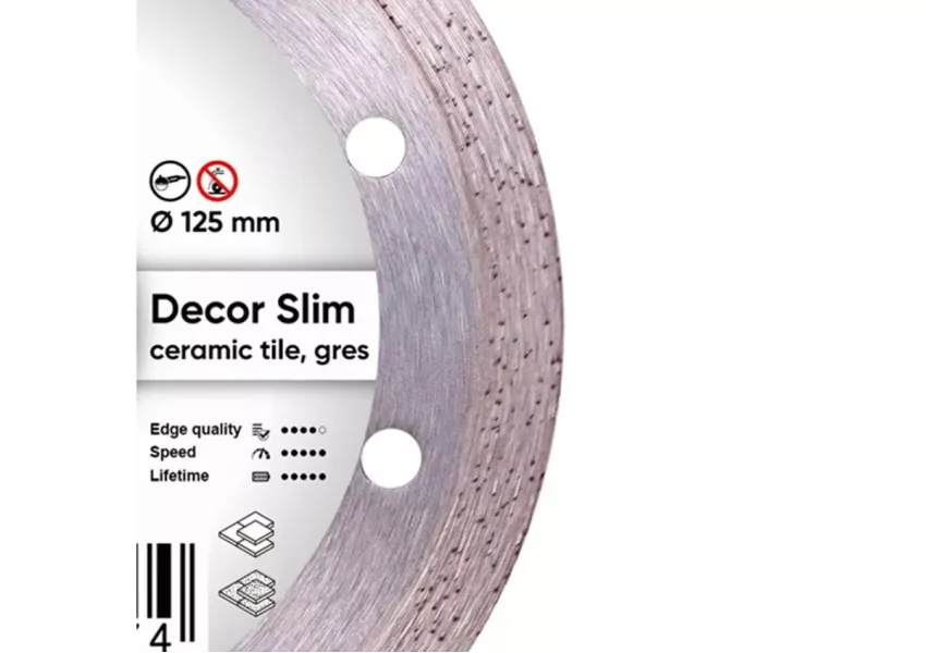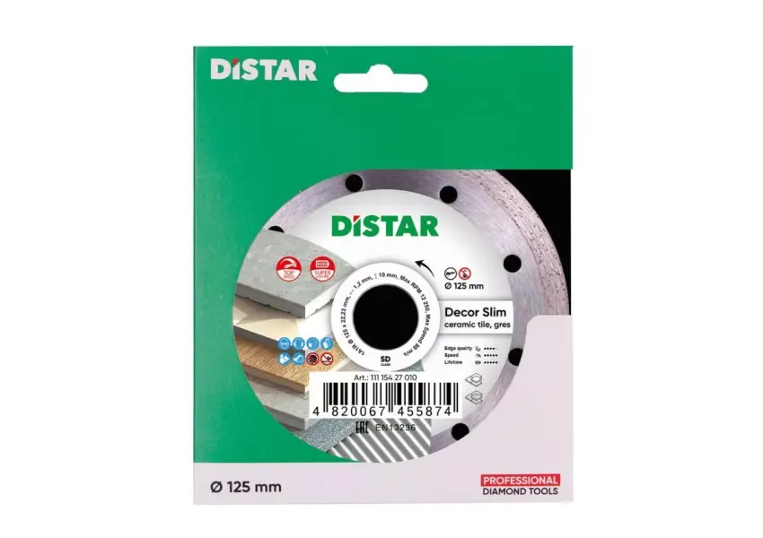 Distar 1A1R Decor Slim 5D ունիվերսալ սկավառակ է՝ նախատեսված ցանկացած տեսակի սալիկի կտրման համար։ Տարբեր մակերեսներին փորձարկումների արդյունքում այս ալմաստե սկավառակը ճանաչվել է ամենաօպտիմալը կերամոգրանիտի, հատակի և պատի սալիկների մշակման համար։