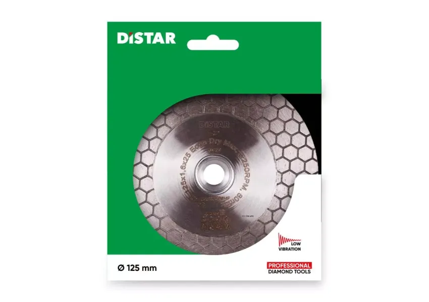 Distar 1A1R Edge Dry սկավառակը կտրում է 45° անկյան ներքո՝ չոր կտրման եղանակով։ Լայն երկկողմանի և 25մմ հաստությամբ ալմաստե շերտը ամրացնում է սկավառակի մարմինը՝ դարձնելով այն կոշտ։ Միևնույն ժամանակ սկավառակը կտրում է ուղիղ, փափուկ և բարձր արդյունավետությամբ։