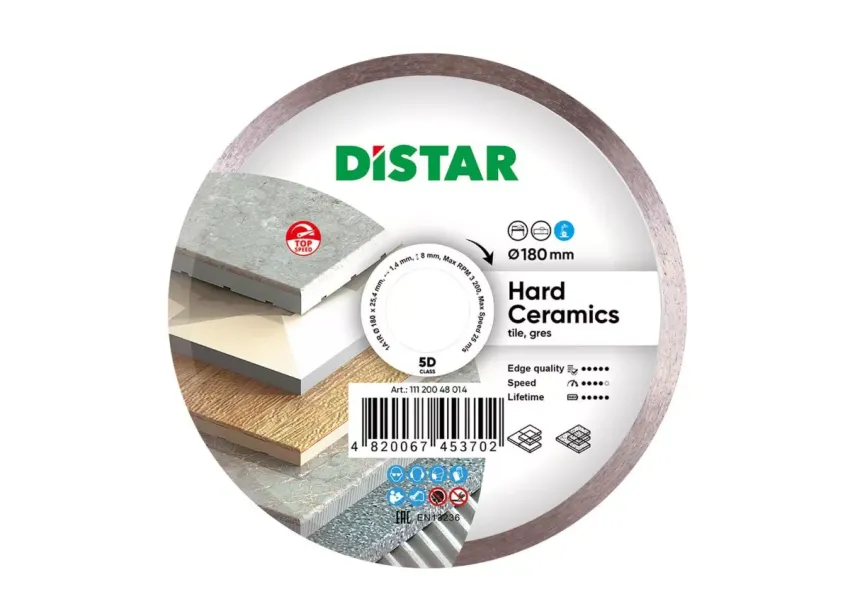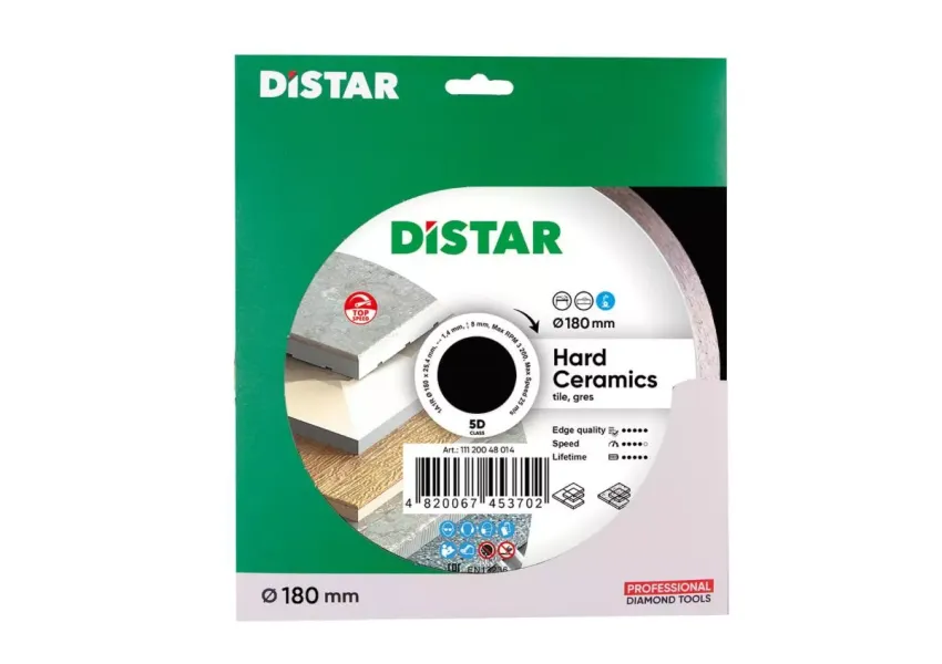 Distar Hard Ceramics սկավառակը նախատեսված է ինչպես դեկորատիվ ծածկույթով, այնպես էլ առանց դրա կերամիկական սալիկների և կերամոգրանիտների կտրման համար։ 1000 գծամետր աշխատանքային ռեսուրսի պայմաններում կտրման արագությունը կազմում է 1․1 գծամետր։ Հիմնականում սկավառակը կիրառվում է ռելիեֆային գլազուրի, պատի և հատակի կերամիկական սալիկների, կերամոգրանիտի, երբեմն՝ նաև գրանիտի և մարմարի տարբեր տեսակների համար։ Սկավառակը համատեղելի է 0․8-1․5կՎտ հզորությամբ սալիկ կտրող սարքերին, որոնց պտույտների հաճախականությունը հասնում է մինչև 2900 պտ/ր։ Որպեսզի սկավառակի բարձր արդյունավետությունը պահպանվի, համատեղելի սարքում ջրի սնուցման պրոցեսը պետք է լինի 5լ/ր արտադրողականությամբ, հակառակ պարագայում՝ սկավառակի կտրման կարողությունը նվազում է։