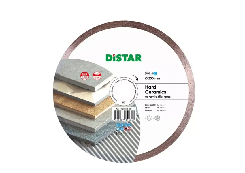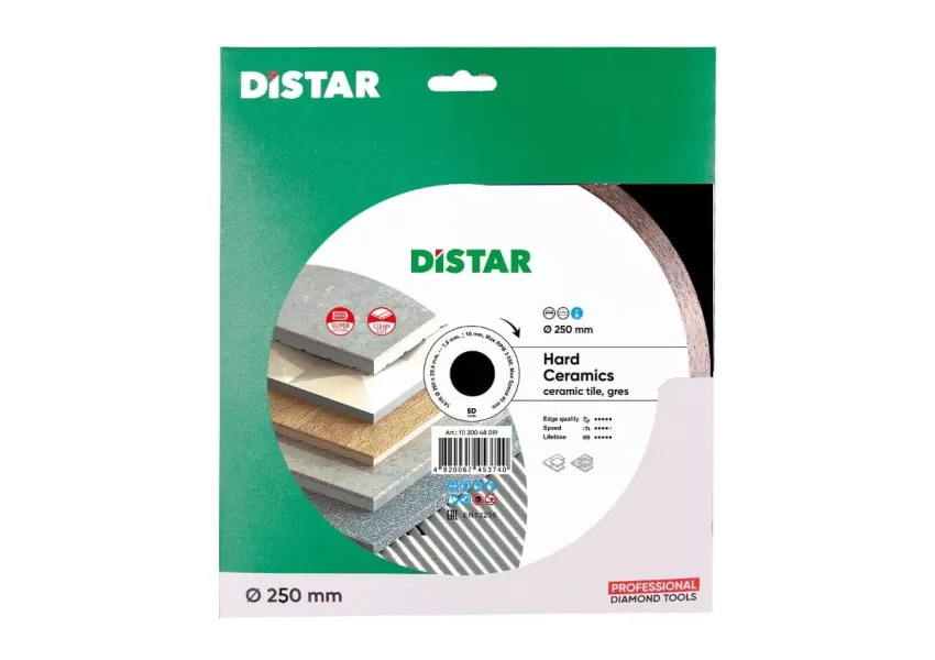 Distar Hard Ceramics սկավառակը նախատեսված է ինչպես դեկորատիվ ծածկույթով, այնպես էլ առանց դրա կերամիկական սալիկների և կերամոգրանիտների կտրման համար։ 1000 գծամետր աշխատանքային ռեսուրսի պայմաններում կտրման արագությունը կազմում է 1․1 գծամետր։