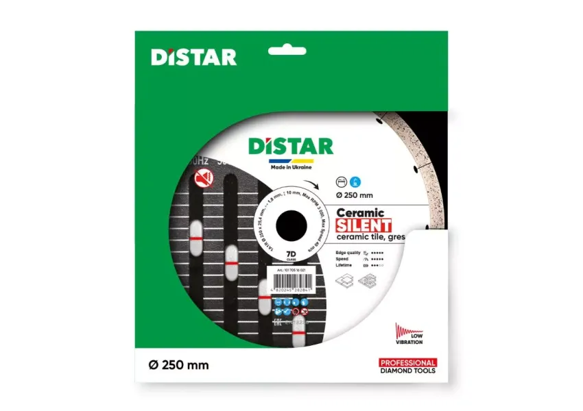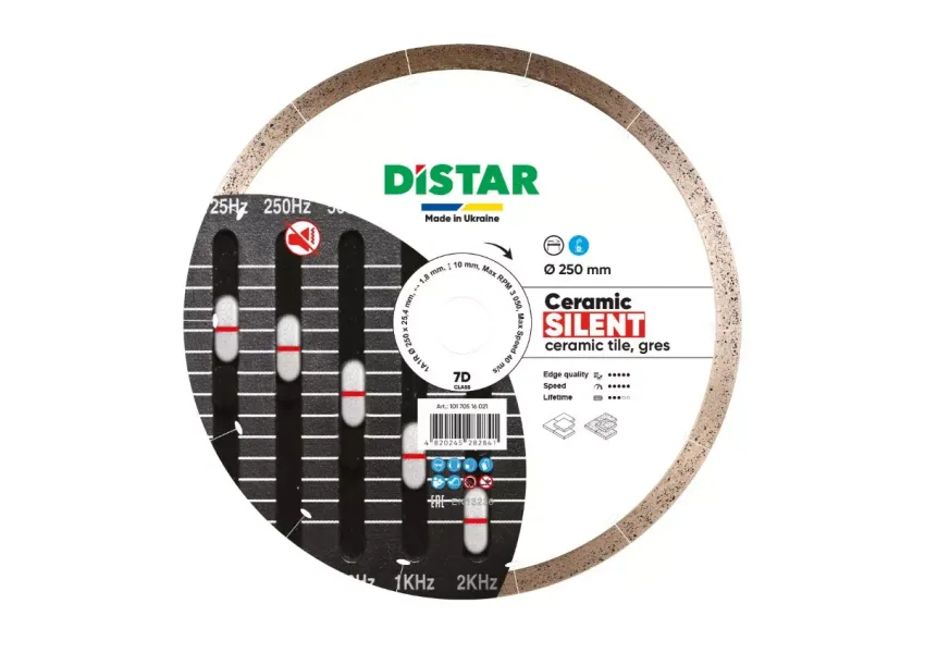Կերամոգրանիտի կտրումը աղմկոտ աշխատանք է։ Այս ակտուալ խնդրի համար լավագույն լուծումը Distar Ceramic Silent սենդվիչային սկավառակն է։ Այսպիսի կառուցվածքը նվազեցնում է բարձր հաճախականությունները, ինչի շնորհիվ փաստացի լսելի է միայն գործիքի/սարքի շարժիչի աղմուկը։ Տվյալ սկավառակի հիմքը Hard Ceramics Advanced սկավառակն է։ Առավելությունները. - կատարյալ եզրեր, - կերամոգրանիտի հաստությունը՝ 20մմ, - աղմուկի մակարդակը՝ 10դԲ, - կիրառվում է միայն թաց կտրմամբ (ջրային հովացմամբ)։