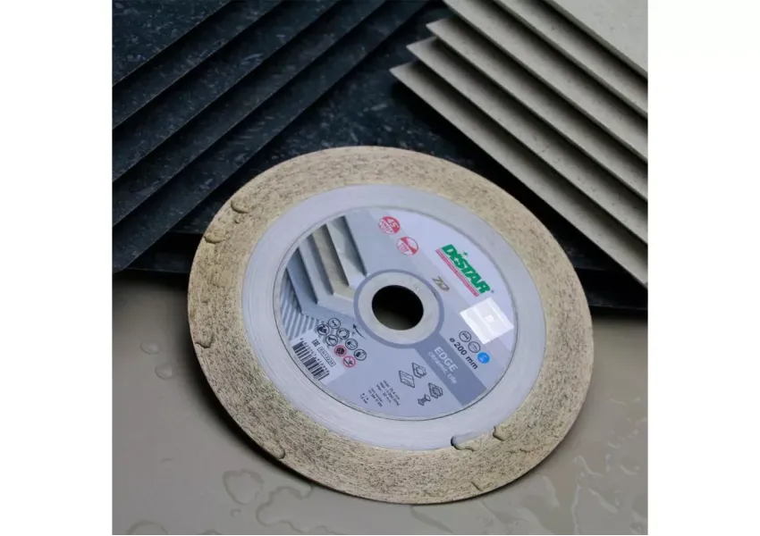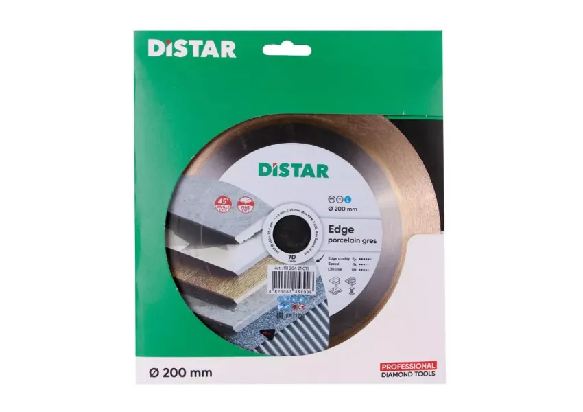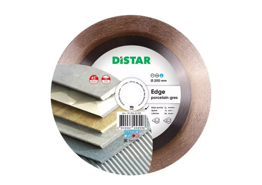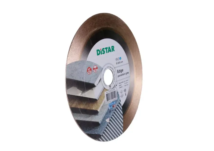 Բոլոր վարպետներն էլ բախվում են խնդրի, երբ 45° անկյան ներքո սալիկի եզրը կտրելիս սկավառակը շեղվում է։ Դա պայմանավորված է նրանով, որ ալմաստե սկավառակների մարմինները կոշտ չեն և բավարար չափով կտրման կարողություն չունեն։ Շեղման հավանականությունը մեծանում է հատկապես ամուր կամ հաստ կերամոգրանիտ կտրելիս։ Մինչդեռ Distar 1A1R Edge սկավառակը ունի լուծում։ Այն նախատեսված է 45°-ով կերամիկական սալիկներ կտրելու համար։ Հաստ միջնանիվը (անվակունդ, ступица) մարմինը դարձնում է կոշտ՝ թույլ չտալով, որպեսզի սկավառակը շեղվի։ Սկավառակի կենտրոնական մասում տեղակայված է խոշոր ալմաստ, իսկ անկյուններում՝ մանր։ Սկավառակը կիրառվում է թաց կտրող (ջրային հովացմամբ) սալիկ կտրող սարքերին։