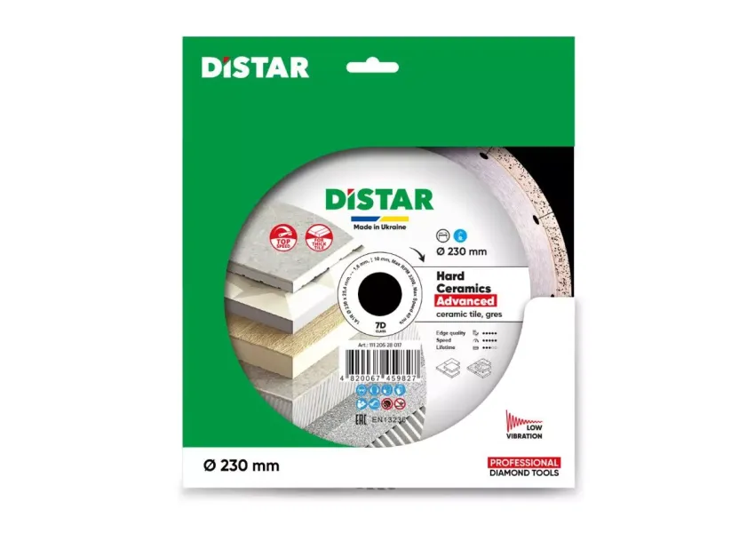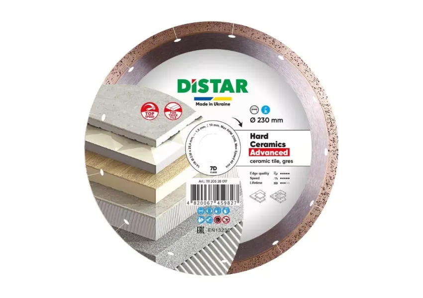 Distar Hard Ceramics Advanced սկավառակը կիրառվում է կերամոգրանիտի, ամուր կերամիկական սալիկների արագ կտրման աշխատանքներում։ Սկավառակի ալմաստե շերտում ներառված են գրաֆիտե չիպսեր, որոնք ձևավորում են սպունգանման կառուցվածք՝ հանդես գալով որպես ամուր քսուք։ Ալմաստե շերտը ենթարկված է լազերային սեգմենտավորման, որը նվազեցնում է ջերմային ներազդեցությունները։
