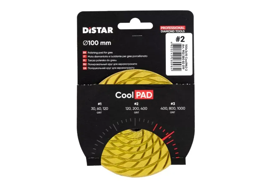 Մշտապես սուր Distar CoolPAD փայլեցնող սկավառակները հատուկ ստեղծված են անկյունային հղկող մեքենայով կերամիկական նյութերի, կերամոգրանիտի չոր հղկման համար։ Ալմաստե շերտն ապահովում է մշակման կայուն բարձր արագություն, ինչի շնորհիվ մակերեսի որակը լավագույնս պահպանվում է՝ չվնասելով կցեզրերը։ Առաջին անգամ կիրառելուց առաջ անհրաժեշտ է սկավառակի աշխատանքային մակերեսը բացել հղկանյութով։ CoolPAD սկավառակները պատրաստվում են մշակման որակի 3 համարներով՝ #1, #2, #3, որոնցից յուրաքանչյուրը փոխարինում է համապատասխանաբար՝ 30/60/120, 120/200/400, 400/800/1000 հատիկավորությունները։