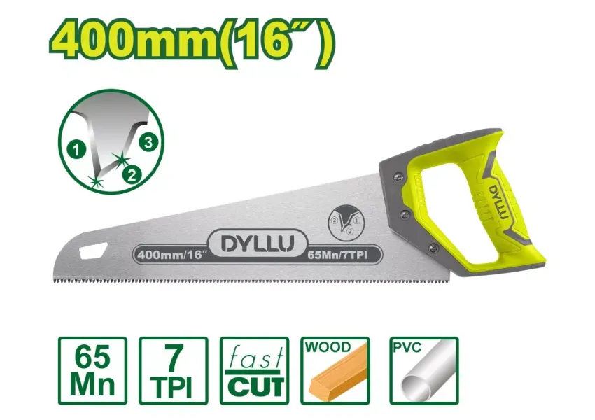 DYLLU DTHW8G16 ձեռքի սղոցը հարմար է ատաղձագործության և այգեգործության մեջ կիրառելիս։ Ունի ատամների պաշտպանիչ, որը կանխում է ավելցուկային սղոցումը։ Ատամները ճշգրիտ հղկված են։ Սղոցելիս ձեռքը չի հոգնում՝ փափուկ բռնակի շնորհիվ։