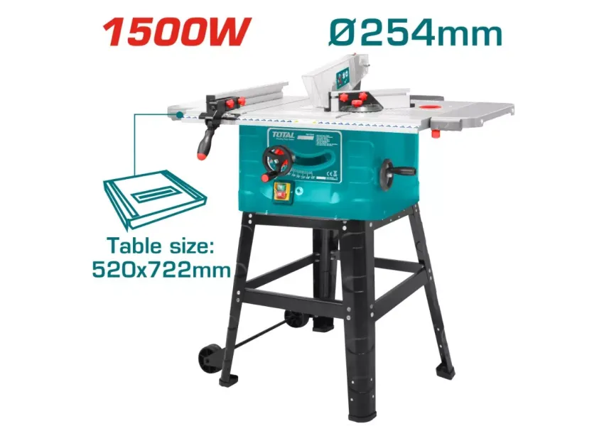 TOTAL TS1222356 սեղանի էլեկտրական սղոցը նախատեսված է փայտանյութերի կտրման համար։ Շարժիչի հզորությունը՝ 1500Վտ։ Համատեղելի սկավառակը՝ 254մմ։