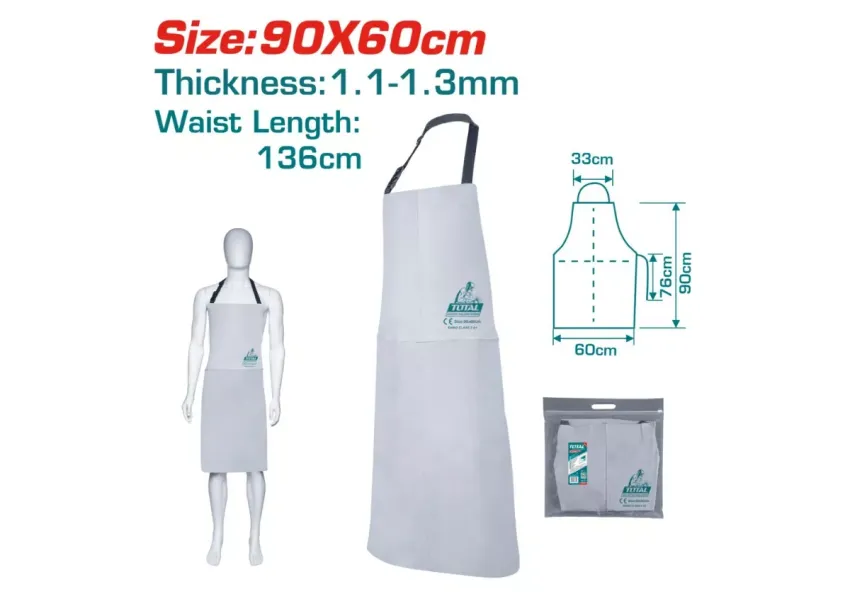 Հագուստի և մաշկի վրա եռակցման կայծերի շաղ տալը թույլ չտալու համար TOTAL TSPWA01 կաշվե գոգնոցն արդյունավետ պաշտպանում է մարմնի առջևի մասը։ Գոգնոցը ջերմամեկուսիչ է և հրակայուն, դիմացկուն է մաշվածության հանդեպ։