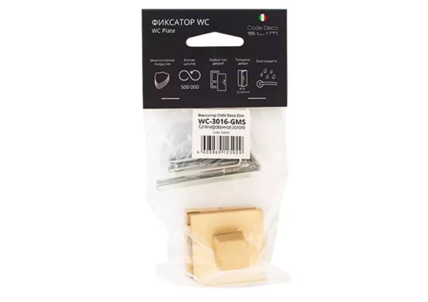 Code Deco Slim WC-3016-GMS ֆիքսատորը նախատեսված է միջսենյակային և սանտեխնիկական դռներին տեղադրելու համար։ Պատրաստված է բարձրորակ ալյումինից և պատված է գալվանական ծածկույթով, ինչն ապահովում է աքսեսուարի դիմացկունությունը ժանգոտման հանդեպ։ Բարակ քառակուսի հիմքով ֆիքսատորը համատեղելի է Code Deco 30 Slim շարքի դռան բռնակներին։ Խորհուրդ է տրվում տեղադրել 40-60 մմ հաստությամբ դռներին։ Փաթեթում ներառված են ամրացման դետալները (2 հատ M4 ձգանակ 12(33)30, 8 հատ ինքնաձիգ պտուտակ ST3*20, 3 հատ ֆիքսման պտուտակ, 2 հատ վեցանկյուն բանալի)։