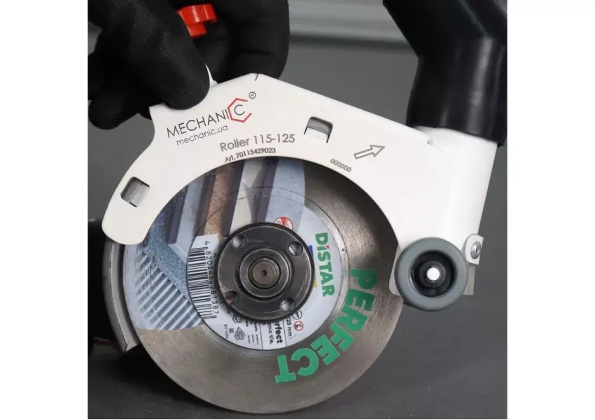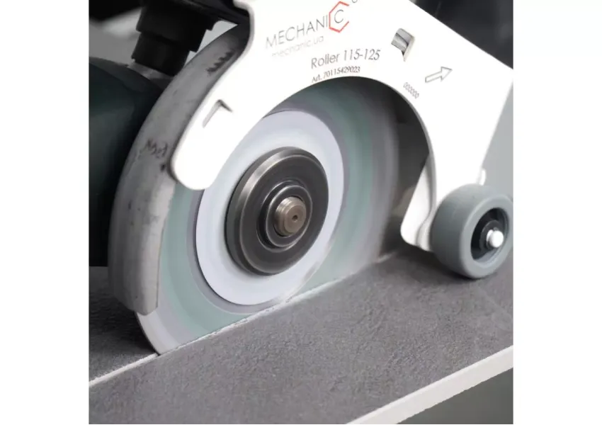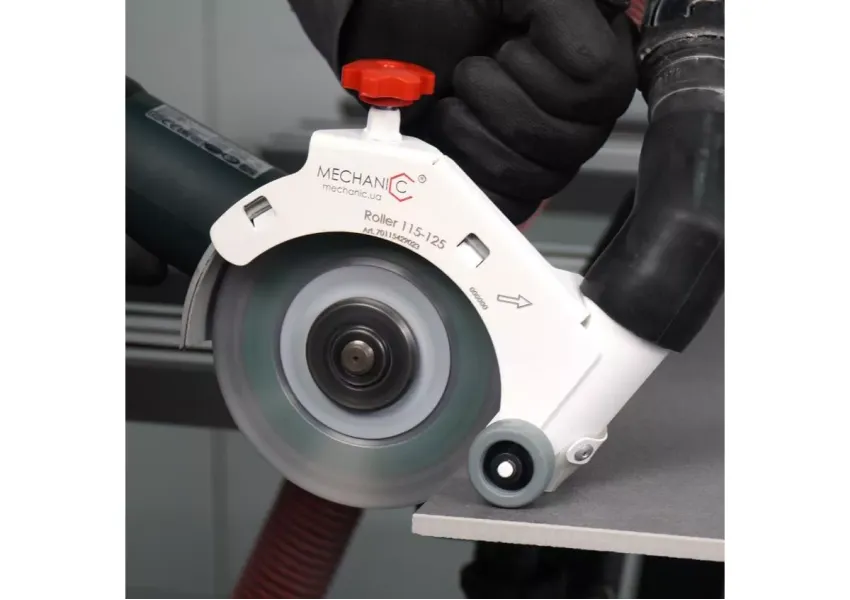 Հեշտ, ճշգրիտ և առանց փոշու: Ձեռքի անկյունային հղկող մեքենայով կերամոգրանիտի կտրումը անկայուն աշխատանք է և կախված է վարպետի հմտություններից։ Roller կցորդիչը զգալիորեն մեծացնում է կտրման կայունությունը և հարմարավետությունը, ինչը ուղղակիորեն ազդում է կտրվածքի որակի վրա: Այժմ կտրումը տեղի է ունենում ոչ թե գործիքի քաշին, այլ անիվներին հենման միջոցով: Շատ ավելի հեշտ է դարձել սկավառակը ուղղորդումը ուղիղ գծով: ԱՀՄ քաշը վարպետի ձեռքից փոխանցվում է սալիկին, ինչը թեթևացնում է ձեռքի ծանրաբեռնվածությունը և ձեռքը չի հոգնում: Փոշեկուլն ամբողջությամբ հեռացնում է փոշին կտրման տարածքից: Սիլիկոնե խտացուցիչը թույլ չի տալիս փոշու ներթափանցումը կտրման վայր: Գլխիկն ունիվերսալ է, կարող է տեղադրվել ցանկացած 115մմ և 125մմ անկյունային հղկող մեքենաների վրա: