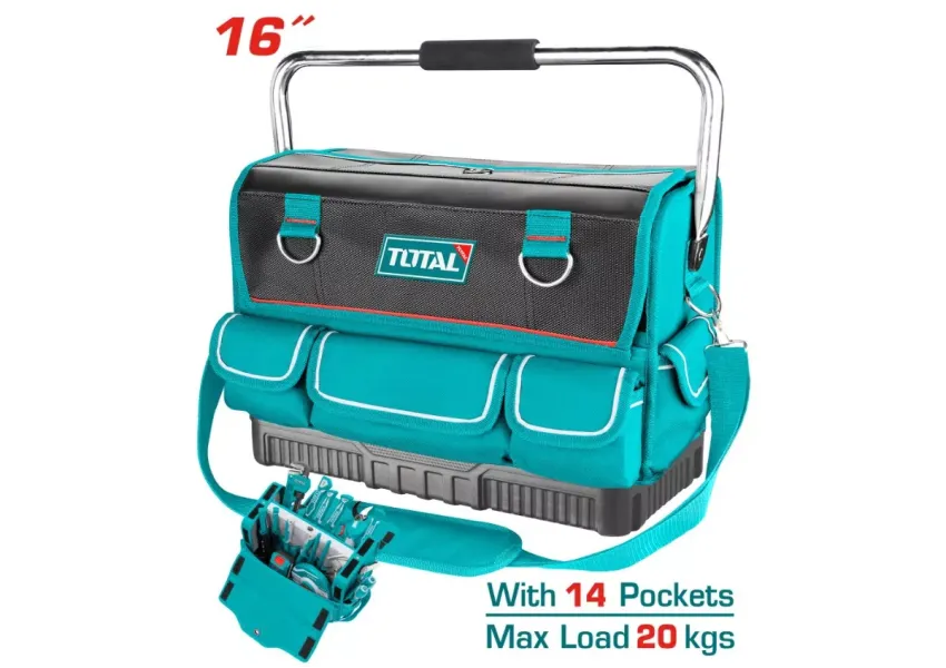 Գործիքների պայուսակն ունի 14 գրպաններ և փափուկ բռնակ հարմարավետության համար: Պատրաստված է ամուր 600D պոլիէսթերից՝ պաշտպանված խոնավությունից: Ունի ուժեղացված պլաստիկ հատակ և ուսադիր՝ հարմարավետ տեղափոխման համար: