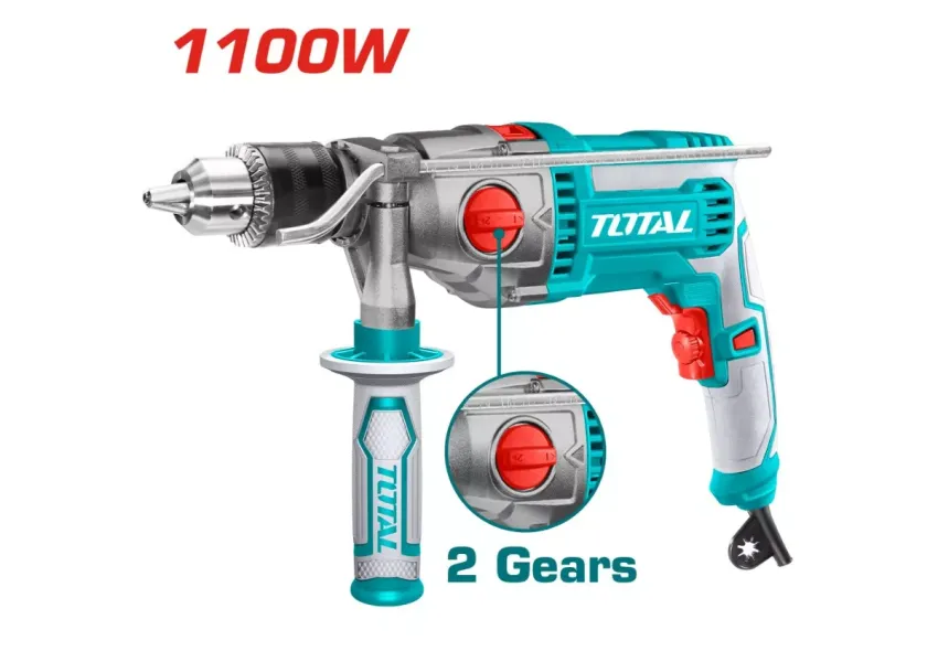TOTAL TG211166 հարվածային գայլիկոնիչը օգտագործվում է փայտ, մետաղ և աղյուս հորատելու համար: Արագության կարգավորումը թույլ է տալիս ընտրել օպտիմալ արագություն՝ կախված աշխատանքի տեսակից և նյութից: Առկա է լրացուցիչ բռնակ՝ հարմարավետ աշխատանքի համար: