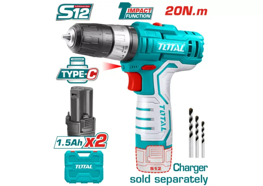 Հարվածային պտուտակադարձիչ մարտկոցային 12Վ 20Նմ (2 մարտկոցով, 4 բիթերով) TOTAL TIDLI12328