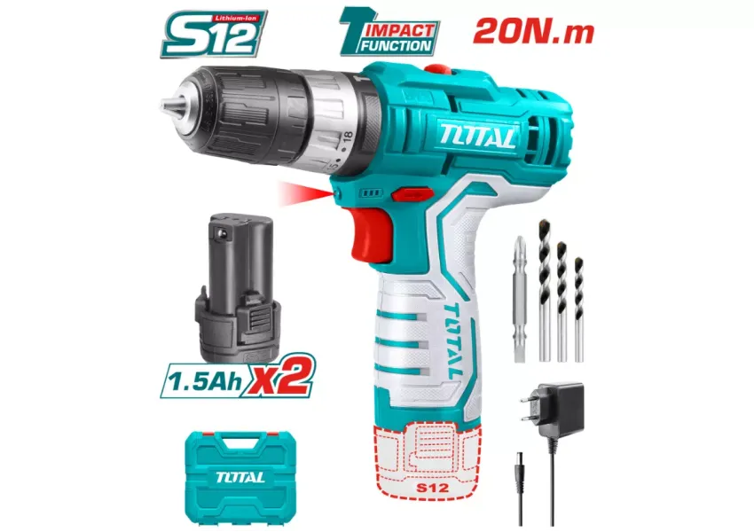 Հարվածային պտուտակադարձիչ մարտկոցային 12Վ 20Նմ (2 մարտկոցով, լիցքավորիչով, 4 բիթերով) TOTAL TIDLI12201