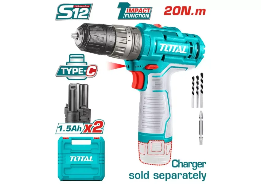 TOTAL TIDLI12202 մարտկոցային պտուտակադարձիչն ունի մեխանիկական 2-աստիճան փոխանցում։ Լիթիում-իոնային գործիքն օժտված է Spindle Lock գործառույթով, ունի մարտկոցի լիցքավորման LED-ցուցիչ։ Հարվածային պտուտակադարձիչի լիցքավորիչը փաթեթում ներառված չէ, առկա է՝ 2 հատ 1.5Աժ մարտկոց (մարտկոցի լիցքավորումը՝ USB type-C), 1 հատ 65մմ սայր՝ քրոմ-վանադիումային պողպատից (Cr-V), 3 հատ քարի գայլիկոն: