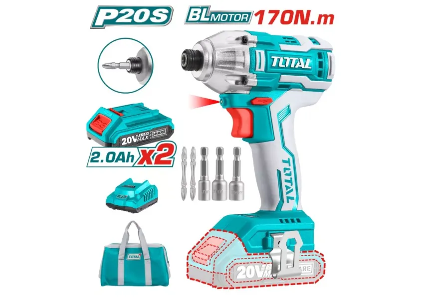 TOTAL TIRLI2002 պտուտակադարձիչը սնուցվում է 2 Աժ լիթիում-իոնային մարտկոցից՝ դրանով իսկ ապահովվելով առավելագույն ինքնավարություն, երբ օգտագործվում է ցանցից հեռու: Այս մոդելի հզորությունը 20 Վոլտ է ՝ առանց բեռնվածքի 0-ից մինչև 2400 պ/ր արագություն, մինչդեռ առավելագույն մոմենտը՝ 170 Նմ: Ներկառուցված LED-լույսը և լիցքավորման մակարդակի ցուցիչը հեշտացնում են այս գործիքի աշխատանքը: Հավաքածուն ներառում է լիցքավորիչ, 2 բիթ 50 մմ(Cr-V): Պտտման կոճակը, հակադարձ անջատիչը և արգելակման կոճակը տեղակայված են ձեռքին հարմար տեղում: