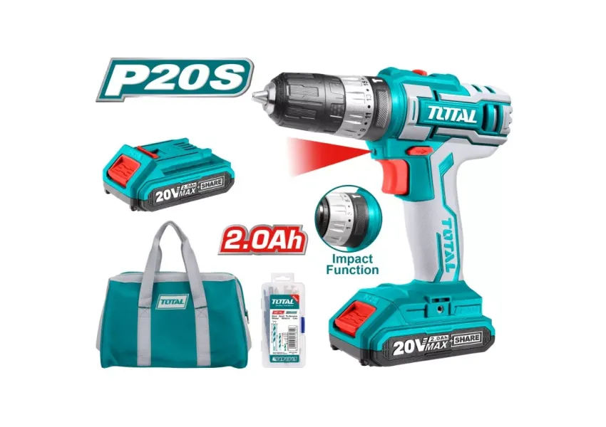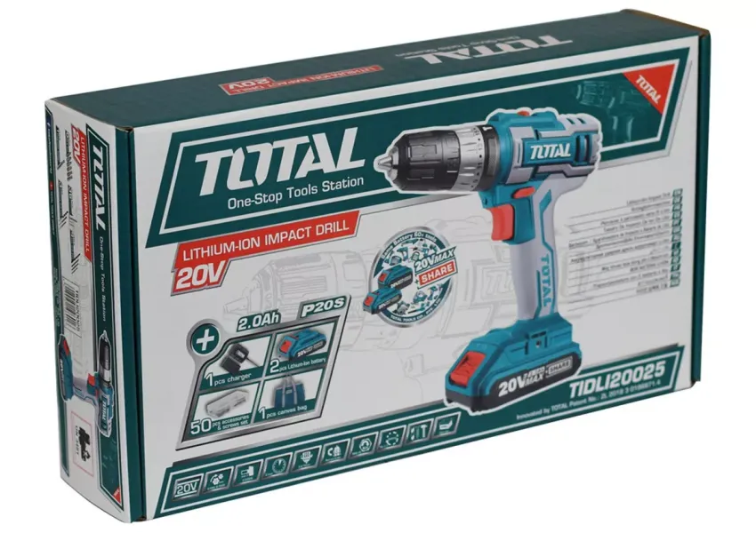 TOTAL TIDLI20025 պտուտակադարձիչը սնուցվում է 2 Աժ լիթիում-իոնային մարտկոցից՝ դրանով իսկ ապահովվելով առավելագույն ինքնավարություն, երբ օգտագործվում է ցանցից հեռու: Լարումը՝ 20 Վ։ Պտտման առավելագույն մոմենտը՝ 45 Նմ: Ներկառուցված LED-լույսը և լիցքավորման մակարդակի ցուցիչը դարձնում են աշխատանքն էլ ավելի արդյունավետ: Ամբողջ հավաքածուն ներառում է պտուտակահան, 2 մարտկոց, լիցքավորիչ, 6 բիթ (Cr-V): Աշխատանքային տարածքը լուսավորելու համար սարքը հագեցած է LED լուսարձակով: Սարքն ունի փոփոխական արագության փոխարկման գործառույթ: Պտտման արագությունը կարգավորվում է 1 - ից մինչև 20 միջակայքում: Պտտման կոճակը, հակադարձ անջատիչը և արգելակման կոճակը տեղակայված են ձեռքին հարմար տեղում: