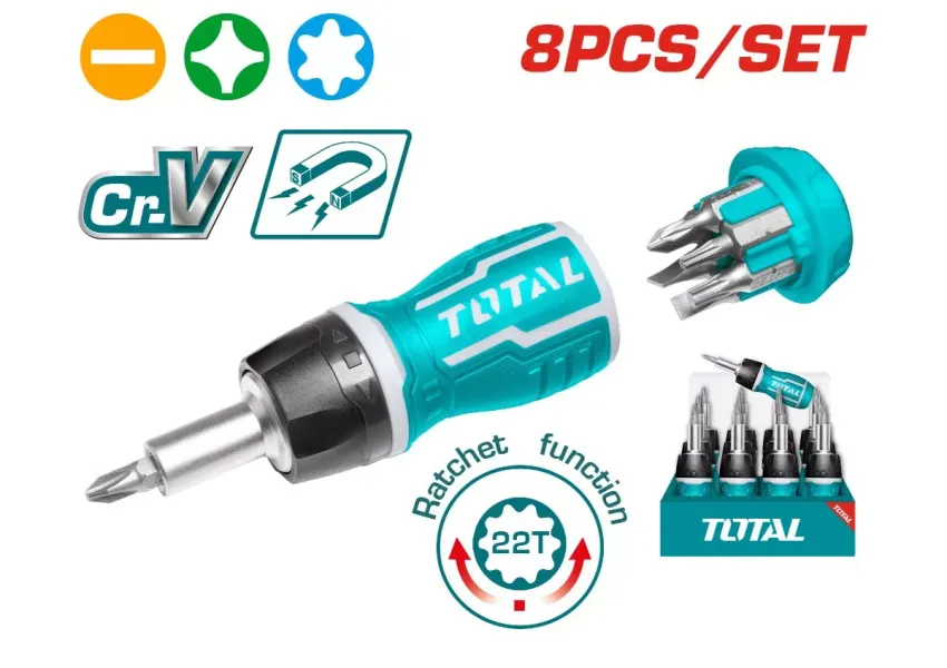 8-ը 1-ում ճռիկավոր պտուտակահանի աշխատանքային մասը պատրաստված է բարձրորակ Cr-V պողպատից։ Հավաքածուն ներառում է՝ 1 հատ ճռիկավոր բռնակ, 7 հատ փոխարինվող բիթ։