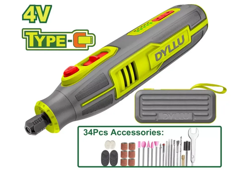 DYLLU DTRYP1504 գրավերը մարտկոցային գործիք է՝ նախատեսված տարբեր նյութերի հղկման և մշակման համար։ Մարտկոցի լիցքավորումը կատարվում է USB-C մալուխի միջոցով (մալուխը վաճառվում է առանձին)։ Փաթեթում ներառված է 34 հատ աքսեսուար։