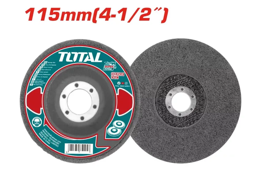 TOTAL TAC661151 սպունգավոր սկավառակը նախատեսված է ամենատարբեր նյութերի մակերեսները փայլեցնելու համար։ Հարմար է փայտի, ապակու, կերամիկայի, մարմարի, ավտոմեքենաների, բետոնի, մետաղի և չժանգոտվող պողպատի մակերեսներին կիրառելու համար։ Տրամագիծը՝ 115մմ։