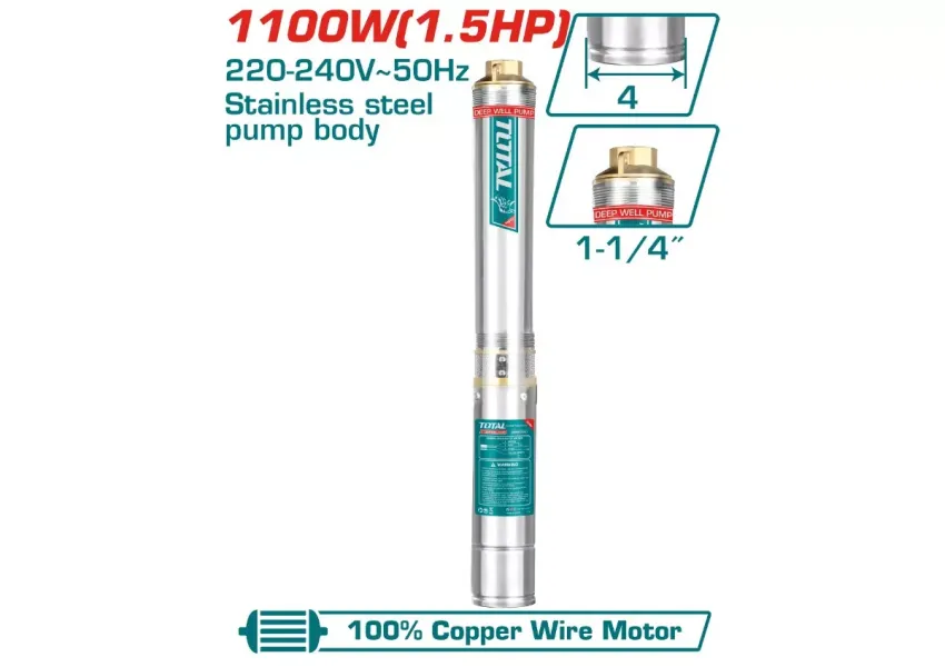 TOTAL TWP511001 սուզվող պոմպը համալրված է 1100 Վտ (1.5 ձ.ու.) շարժիչով։ Հուսալի կերպով քաշում է ջուրը տարբեր նշանակության տարածքներում։ Պղնձե մետաղալարով հզոր շարժիչը ապահովում է սարքի կայուն և երկարակյաց աշխատանքը։ Չժանգոտվող պողպատից պատրաստված պոմպի կորպուսը պաշտպանում է ժանգոտումից և նախատեսված է ծանր պայմաններում երկարատև շահագործման համար։ Մինչև 112 մ առավելագույն բարձրացումն ապահովում է ջրի մատակարարումը խոր հորերից։ Արտադրողականությունը՝ 6 մ³/ժ, ինչի շնորհիվ պոմպը իդեալական է նաև կենցաղային և տնտեսական նպատակների համար։ Բազմաստիճան աշխատանքային անիվը երաշխավորում է հարթ և հուսալի աշխատանք։ 1-1/4” խողովակի տրամագիծը ապահովում է օպտիմալ թողունակություն, իսկ 20 մետր երկարությամբ մալուխը թույլ է տալիս տեղադրել պոմպը դժվար հասանելի վայրերում։ Այս պոմպը իդեալական ընտրություն է հողամասի սեփականատերերի համար, ովքեր պահանջում են հուսալի ջրամատակարարում աղբյուրներից և հորերից։