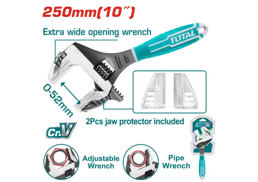 Բանալին կատարում է 2-ը 1-ում գործառույթ՝ նախատեսված է և որպես կարգավորվող, և որպես խողովակի բանալի օգտագործելու համար։ Ներառված է ծնոտների 2 հատ պաշտպանիչ։ Բացվածքը՝ 0-52մմ"