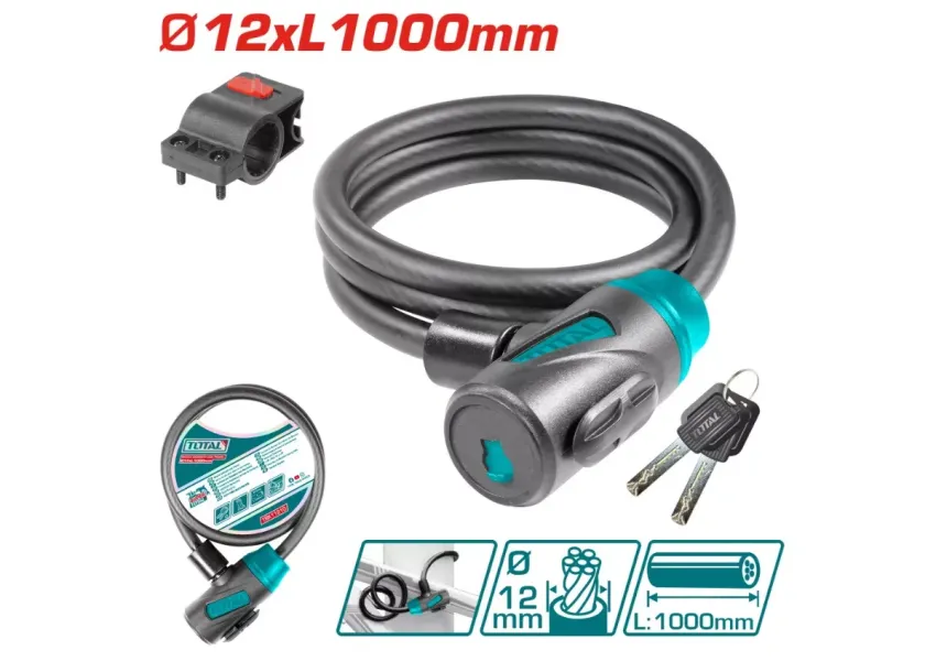 TOTAL բրենդն առանձնանում է իր բարձրորակ արտադրանքով։ TOTAL TBK11210 կողպեքը նախատեսված է հեծանիվը առևանգումից պաշտպանելու համար։ Համալրված է գլանային գաղտնիության մեխանիզմով։ ՊՎՔ ծածկույթով պատված ճոպանը պատրաստված է բարձրորակ նյութից։ Փաթեթում ներառված է 2 հատ արույրե բանալի։