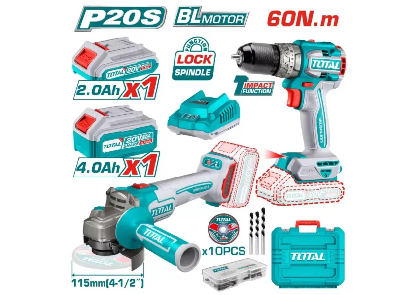 Կոմբո հավաքածուն ներառում է 1 հատ 115մմ անկյունային հղկող մեքենա (TAGLI21154), 1 հատ մարտկոցային պտուտակադարձիչ (TIDLI206681): Փաթեթում առկա են նաև՝ - 10 հատ մետաղ կտրող հղկանյութային սկավառակ, - 47 հատ աքսեսուար, - 1 հատ 2.0Աժ մարտկոց (TFBLI20011) - 1 հատ 4.0Աժ մարտկոց (TFBLI20021) - 1 հատ լիցքավորիչ՝ P20S մարտկոցների համար (TFCLI2001)։