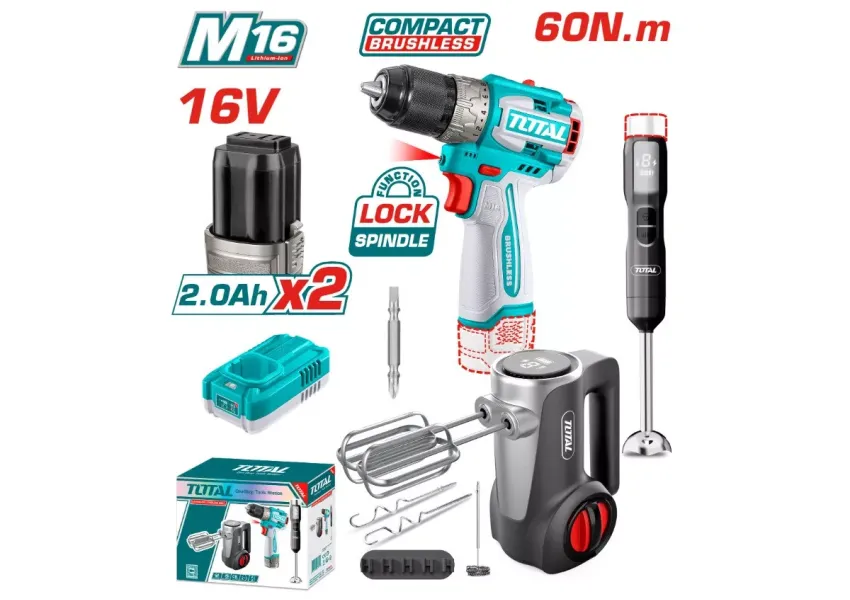 TOTAL ապրանքանիշը նաև ընտանեկան է, քանի որ ստեղծում է գործիքներ և սարքեր ոչ միայն տղամարդկանց և շինարարության ոլորտում կիրառելու համար, այլև կանանց և խոհանոցային օգտագործման նպատակով։ Այս կոմբո հավաքածուն ևս այդպիսին է։ Այն ներառում է 1 հատ պտուտակադարձիչ (TDLI16681), 1 հատ ձեռքի բլենդեր (TJB047K), 1 հատ ձեռքի խառնիչ (TMK022K)։ Հավաքածուն նախագծված է այնպիսի հարմարավետությամբ, որպեսզի ներառված գործիքն ու 2 սարքը կարող են աշխատել նույն M16 տեսակի մարտկոցով։ Մարտկոցային պտուտակադարձիչը հագեցած է անխոզանակ շարժիչով։ Գործիքն ունի սռնակի արգելափակման (Spindle lock) գործառույթ։ Առկա է մեխանիկական արագության 2 ռեժիմ։ 125Վտ ձեռքի խառնիչն ունի 7 աշխատանքային ռեժիմ։ Առկա է LED էկրան։ Ձեռքի բլենդերի հզորությունը՝ 100Վտ։ Արագությունը կարգավորվող է՝ 5 ռեժիմ։ Առկա է LED էկրան և 2 հատ սայր՝ չժանգոտվող պողպատից։ Ձեռքի սարքն օժտված է հյութաքամիչի և մրգային պյուրեներ խառնելու գործառույթով։ Փաթեթում ներառված են նաև․ - 1 հատ 65մմ քրոմ-վանադիումային (Cr-V) բիթ, - 2 հատ խառնիչ-թևիկ, - 2 հատ կեռաձև հարիչ, - 1 հատ փրփրացնող թևիկ, - 2 հատ M16 2.0Աժ 16Վ մարտկոց (TFBLI1620), - 1 հատ M16 լիցքավորիչ (TFCLI1613)։