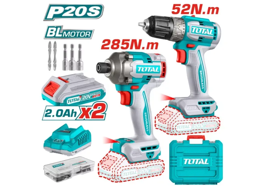 Մարտկոցային գործիքների հավաքածուի մեջ ներառված են՝ 1 հատ պտուտակադարձիչ (TDLI204531), 1 հատ հարվածային գայկավյորտ (TIRLI2028): TOTAL TDLI204531 52Նմ մարտկոցային պտուտակադարձիչը ունի մեխանիկական արագության 2 ռեժիմ։ Առկա է սռնակի արգելափակման (Spindle lock) գործառույթ։ Պտույտների քանակը՝ 0-550պտ/ր, 0-2000պտ/ր։ TOTAL TIRLI2028 285Նմ հարվածային գայկավյորտը հագեցած է անխոզանակ շարժիչով։ Հարվածների հաճախականությունը րոպեում՝ 0-2100/0-2500/0-2900։ Փաթեթում. - 1 հատ 20Վ լիցքավորիչ (TFCLI2001), - 2 հատ 2.0Աժ մարտկոց (TFBLI20011), - 47 հատ աքսեսուար, - 2 հատ պտուտակադարձիչի բիթ, - 3 հատ բռնիչ գայկաների։