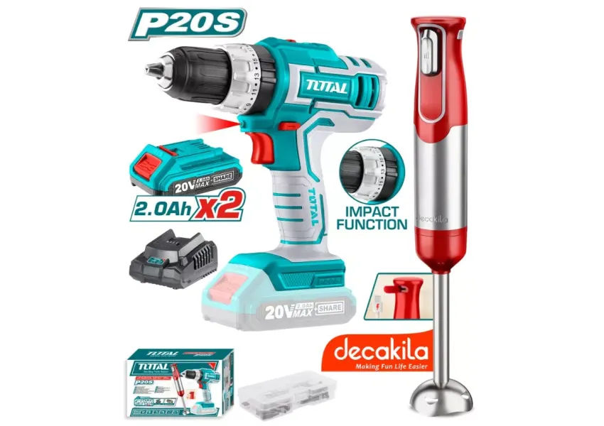 TOTAL TOSLI22112 մարտկոցային հավաքածուն ներառում է 20 Վ պտուտակադարձիչ և ձեռքի բլենդեր KMJB023R, ինչպես նաև երկու մարտկոց։ Գործիքները առանձնանում են բարձր արտադրողականությամբ և հուսալիությամբ։