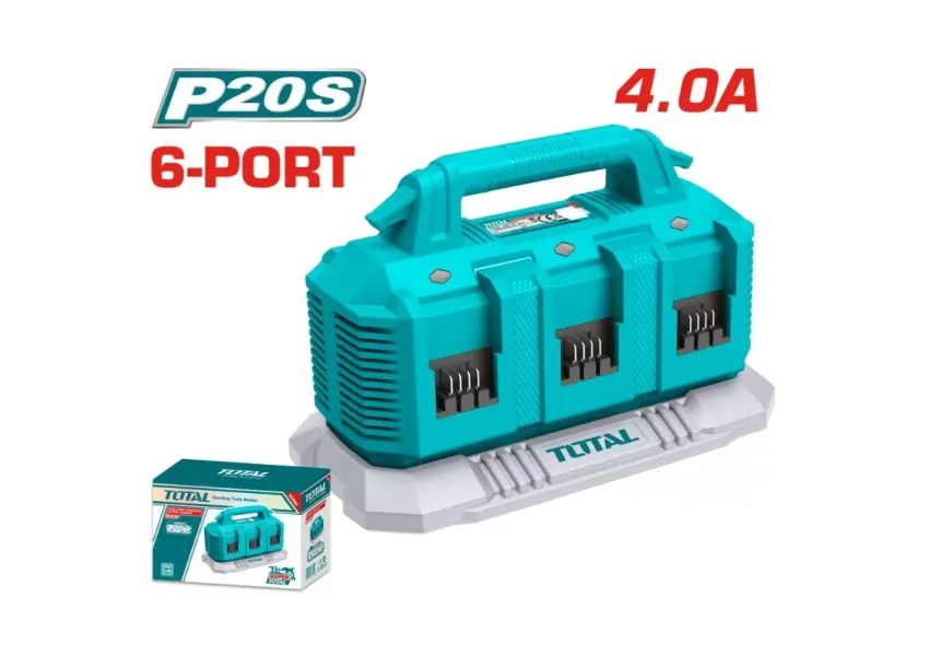Լիցքավորիչը հարմար է TOTAL ապրանքանիշի բոլոր P20S 20Վ մարկտոցների համար։ Կարող է հաջորդաբար լիցքավորել 6 մարտկոց։ 2Աժ հզորությամբ 2 հատ մարտկոցը լիցքավորում է 30 րոպեում, իսկ 4Աժ հզորությամբ նույնքան մարտկոցը՝ 1 ժամում։