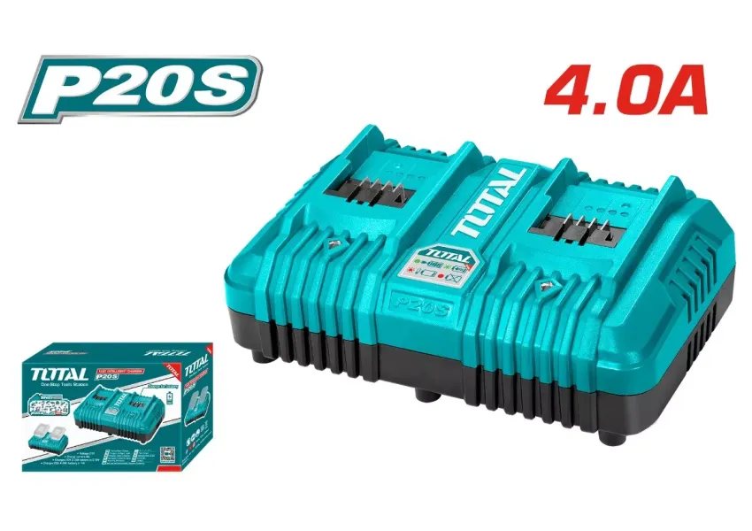 Արագ լիցքավորիչը համատեղելի է 20Վ TOTAL P20S մարտկոցների հետ։ Միաժամանակ կարող է լիցքավորել 2 մարտկոց։ 2 հատ 2․0Ա*ժ մարտկոցները լիցքավորում է 30 րոպեում, 2 հատ 4․0Ա*ժ մարտկոցները լիցքավորում է 1 ժամում։