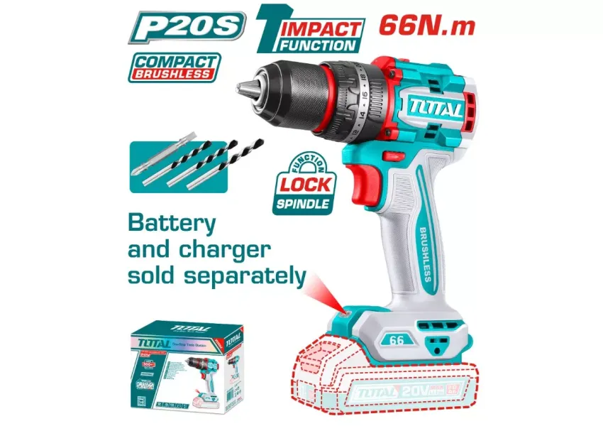 TOTAL TIDLI206681 20Վ պտուտակադարձիչը հարվածային է (30000պտ/ր)։ Առկա է սռնակի արգելափակման (Spindle lock) գործառույթ։ Մարտկոցով աշխատող ձեռքի գործիքը համալրված է անխոզանակ շարժիչով, ունի ներկառուցված աշխատանքային LED լույս, ինչը հեշտացնում է աշխատանքը մութ և դժվար հասանելի վայրերում։ Փաթեթում ներառված են՝ 1 հատ 65մմ երկկողմանի քրոմ-վանադիումային (Cr-V) բիթ, 3 հատ բետոնի գայլիկոն։ Մարտկոցն ու լիցքավորիչը վաճառվում են առանձին։