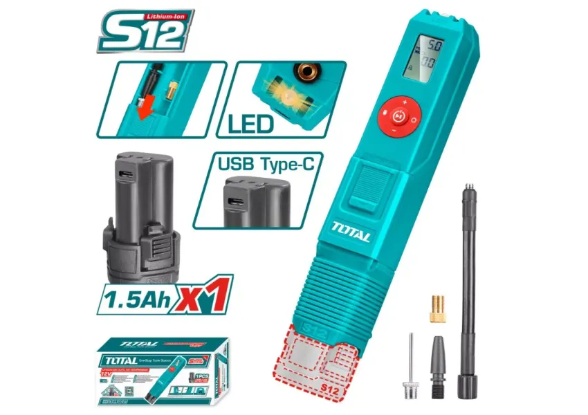 TOTAL TACLI12012 մարտկոցային ավտոկոմպրեսորը նախատեսված է անվադողերի և այլ փչովի իրերի արագ փչման համար: Ապահովում է մինչև 120 PSI ճնշում, հագեցած է թվային էկրանով և ավտոմատ անջատման ֆունկցիայով՝ սահմանված ճնշմանը հասնելու դեպքում: Ունի ներկառուցված LED լույս: Փաթեթում ներառված են ադապտերներ: