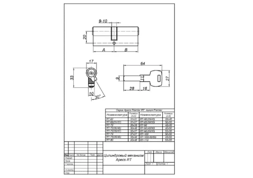 Բարձրորակ Apecs RT գլանային մեխանիզմները պատրաստված են արույրից: Նախատեսված են մուտքի դռների համար: Միջուկները փորձված են և ունեն սերտիֆիկատ համաձայն՝ ԳՕՍՏ 5089-2011: Գլանային մեխանիզմները պաշտպանված են հարվածներից և հորատումից: Խորհուրդ տրվող պարագաներ՝ միջուկների հետ տեղադրման համար (վաճառվում են առանձին)․ Apecs Protector Basic, Apecs Protector Pro 50։