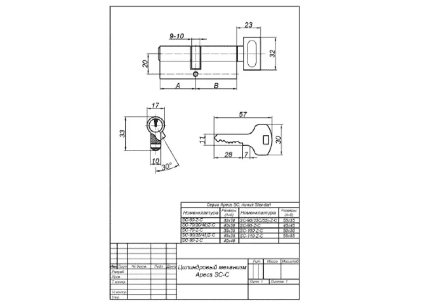 Apecs SC գլանային մեխանիզմները պատրաստված են արույրից: Նախատեսված են մուտքի դռների համար: Միջուկները փորձված են և ունեն սերտիֆիկատ համաձայն՝ ԳՕՍՏ 5089-2011: Գլանային մեխանիզմները պաշտպանված են հարվածներից և հորատումից: Խորհուրդ տրվող պարագաներ՝ միջուկների հետ տեղադրման համար (վաճառվում են առանձին)․ Apecs Protector Basic, Apecs Protector Pro 50։