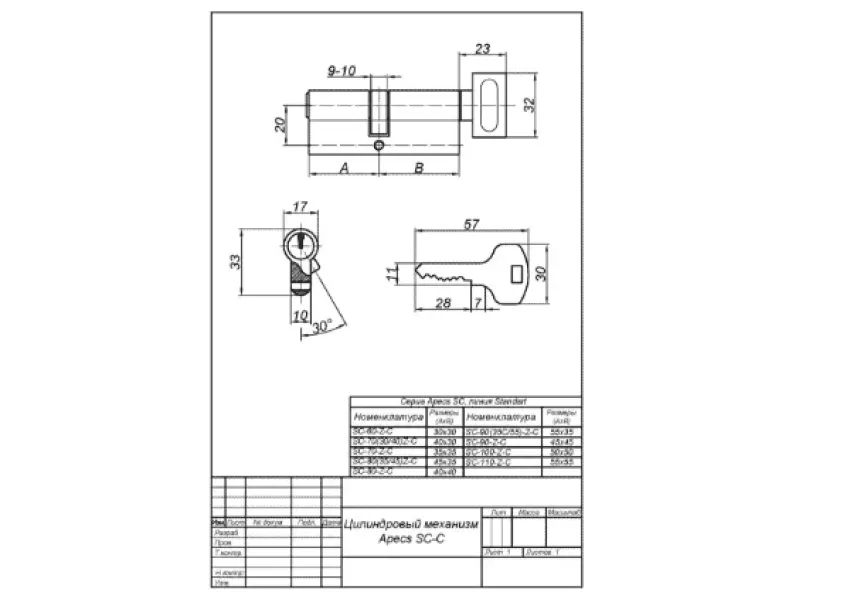 Apecs SC գլանային մեխանիզմները պատրաստված են արույրից: Նախատեսված են մուտքի դռների համար: Միջուկները փորձված են և ունեն սերտիֆիկատ համաձայն՝ ԳՕՍՏ 5089-2011: Գլանային մեխանիզմները պաշտպանված են հարվածներից և հորատումից: Խորհուրդ տրվող պարագաներ՝ միջուկների հետ տեղադրման համար (վաճառվում են առանձին)․ Apecs Protector Basic, Apecs Protector Pro 50։