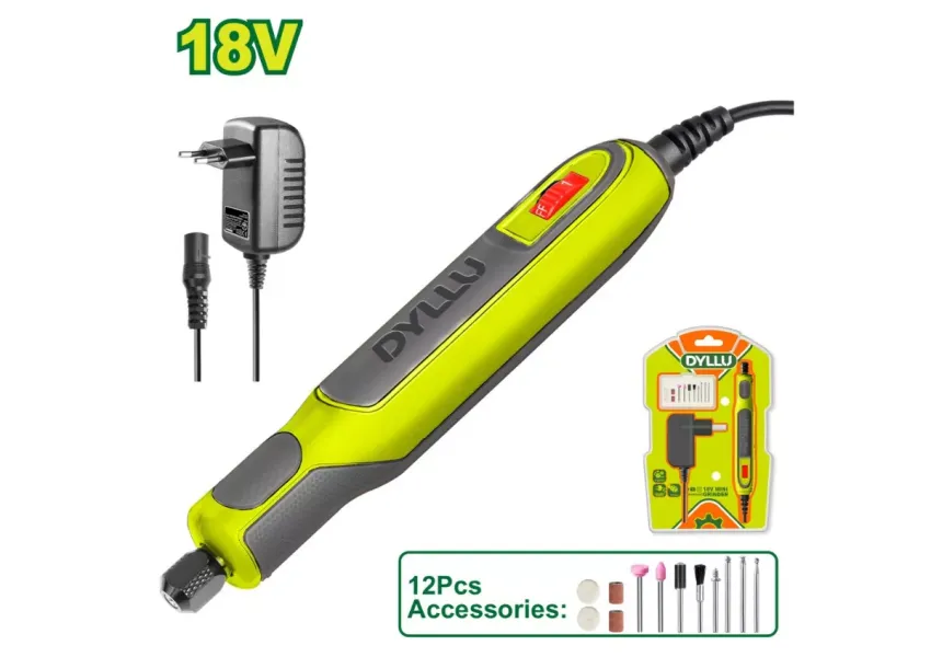 Նախատեսված է տարբեր նյութերի մշակման համար։ Հղկող գործիքն ունի արագության կարգավորման գործառույթ։ Փաթեթում ներառված է. - 12 հատ աքսեսուար, - 1 հատ փոփոխական և հաստատուն հոսանքով ադապտեր՝ մալուխով: