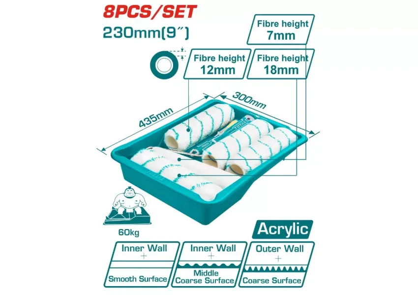 Նախատեսված է ներքին պատերին ներկերի և լաքերի կիրառման համար: Փաթեթում՝ 1 հատ գլան 7x230 մմ, 3 հատ գլան 12x230 մմ, 1 հատ գլան 18x230 մմ, 1 գատ ներկագլանի օժանդակ մաս 230 մմ, 1 հատ ներկի սկուտեղ։