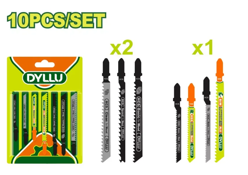 Նրբասղոցի փայտ ու մետաղ կտրող դանակների հավաքածուն ներառում է՝ - 2 հատ 101D (100x8x1.45մմ). ատամները՝ 6T, - 2 հատ 244D (100x8x1.2մմ). ատամները՝ 6T, - 2 հատ 111C (100x8x1.2մմ). ատամները՝ 8T, - 1 հատ 101AO (83x8x1.3մմ). ատամները՝ 18T, - 1 հատ 118A (76x8x0.92մմ). ատամները՝ 21T, - 1 հատ 127D (100x8x0.92մմ). ատամները՝ 8T, - 1 հատ 119BO (76x8x1.0մմ). ատամները՝ 12T։