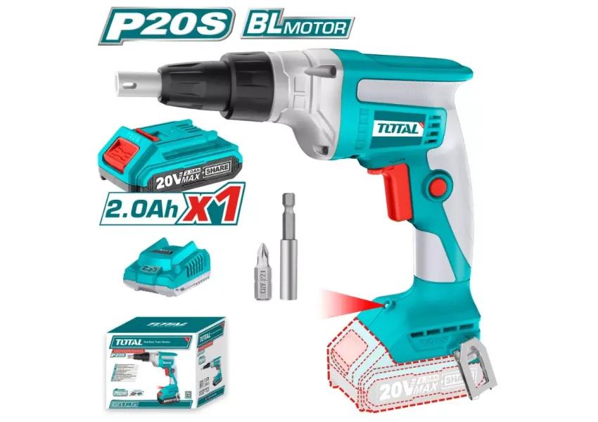 TOTAL TDSLI204200 գիպսաստվարաթղթի պտուտակահանը պրակտիկ գործիք է։ Սարքի պտտման առավելագույն ուժը 30 նմ է։ Փաթեթում ներառված են՝ 1 հատ 2.0 Աժ վերալիցքավորվող մարտկոց, 1 հատ լիցքավորիչ, 1 հատ բիթ բռնիչ։